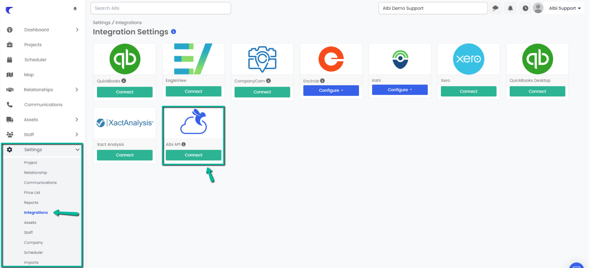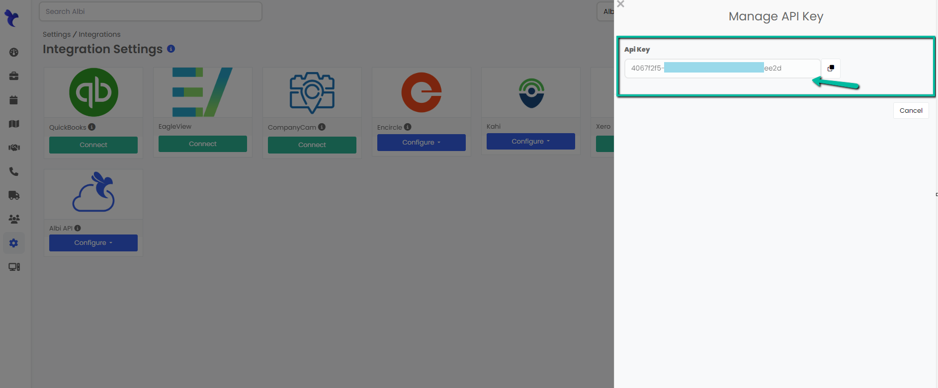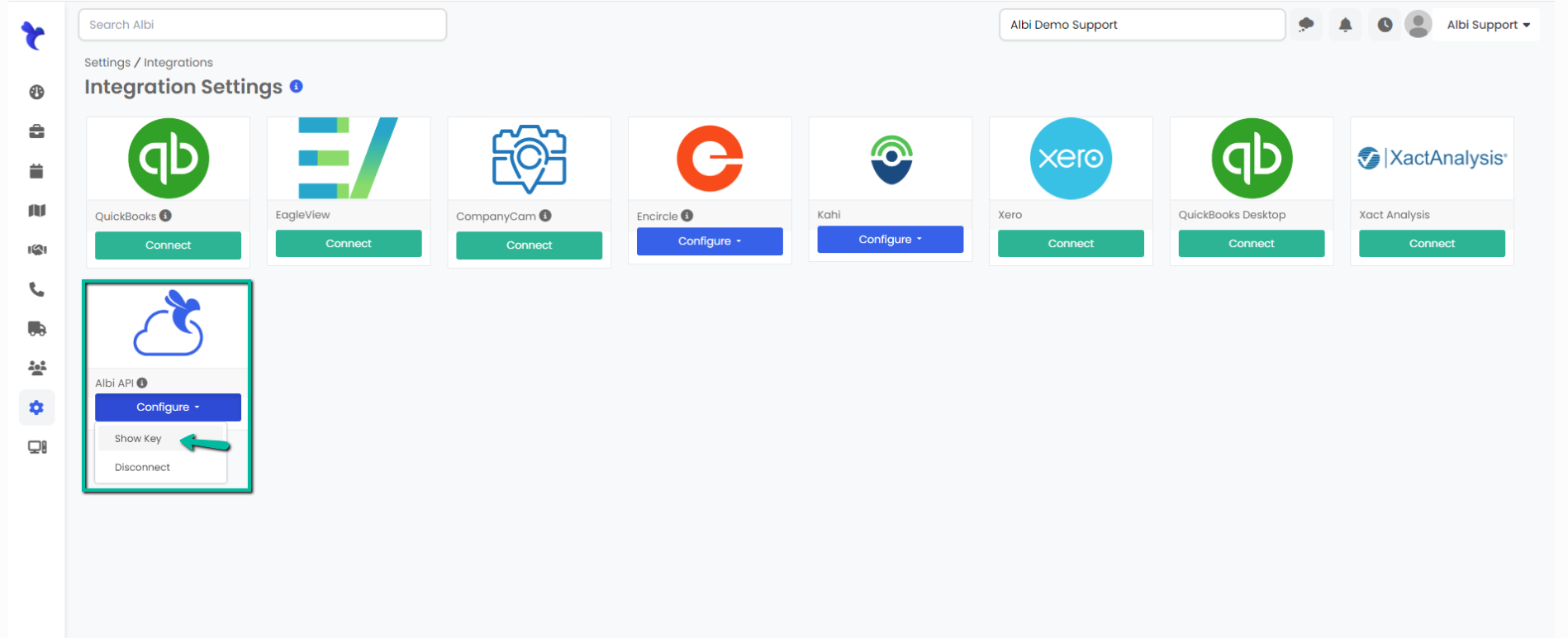 Click Configure under the Albi API section.